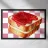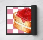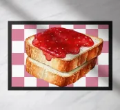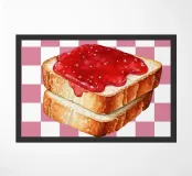 Une pile de trois tranches de pain grillé recouvertes d'une généreuse couche de confiture rouge vif se détache sur un fond à carreaux roses et blancs. La représentation réaliste du pain contraste avec l'arrière-plan ludique et géométrique.