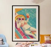 Cette peinture numérique humoristique et vibrante représente un chat blanc duveteux qui se détend sur un flotteur de piscine, profitant pleinement des vacances d'été. Le chat est vêtu d'un bikini à pois ludique et d'un chapeau de soleil à tranches de kiwi géantes, tout en portant des lunettes de soleil miroirs violettes et en sirotant un cocktail. L'œuvre utilise une palette lumineuse et saturée d'aqua, de rose et d'orange, ce qui lui confère une forte connotation rétro Pop Art et maximaliste. Ce poster numérique de haute qualité (7000x5000 pixels, 300 dpi) est une pièce parfaite pour un espace vivant, amusant et moderne.