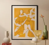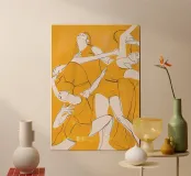 Une œuvre d'art abstraite représentant des figures féminines dansantes, tracées en noir sur un fond jaune vibrant, exprimant le rythme et le mouvement dans un style minimaliste.