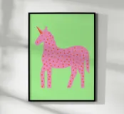 Cette illustration ludique montre une licorne rose avec des points sur fond orange et vert, parfaite pour les chambres d'enfants ou la décoration estivale. Le graphisme peint à la main combine des éléments fantaisistes avec un design minimaliste, créant une atmosphère joyeuse qui respire la joie et la créativité.
