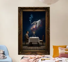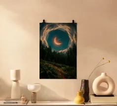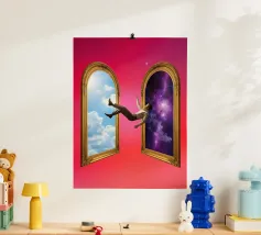 Cette œuvre d'art surréaliste représente deux personnages vêtus qui marchent main dans la main à travers une ancienne arche de pierre en direction d'un ciel lumineux aux teintes roses et violettes. Au-dessus d'eux flotte un œil géométrique radieux, symbolisant la conscience, le mystère et une compréhension plus profonde. Le mélange d'architecture historique, de couleurs douces de coucher de soleil et d'iconographie symbolique crée une scène pleine de sens et d'imagination. Idéal pour les amateurs d'art spirituel, de récits surréalistes et de décors muraux qui suscitent la curiosité et la réflexion.