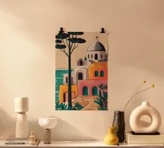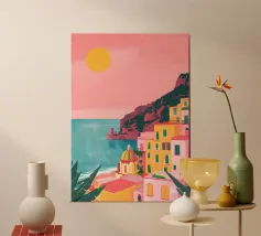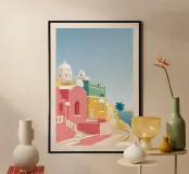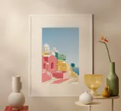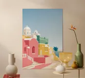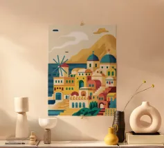 Illustration pittoresque des bâtiments blancs et des dômes bleus emblématiques d'une île grecque, probablement Santorin, surplombant la mer. La scène est une représentation parfaite, baignée de soleil, d'un paradis méditerranéen.