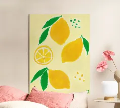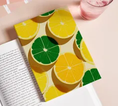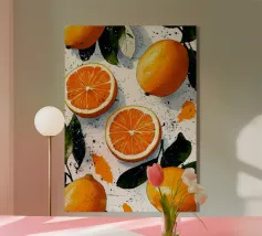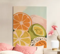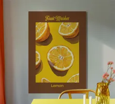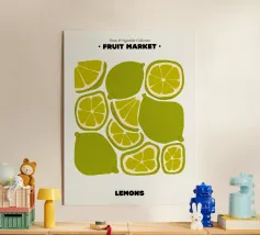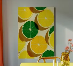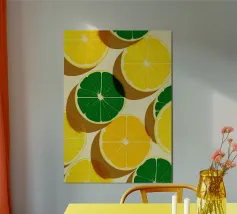 Une œuvre d'art numérique audacieuse et ludique présentant des tranches de citron et de citron vert stylisées, disposées dans un motif géométrique vibrant. Avec des ombres nettes et une texture de papier tactile, ce dessin fusionne l'esthétique Bauhaus et la fraîcheur méditerranéenne. Parfait pour la décoration de la cuisine, les impressions estivales ou les amateurs d'art mural moderne.