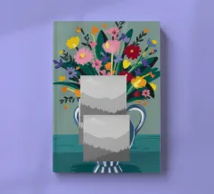 Un vase bleu abstrait de forme libre contient un bouquet coloré, posé sur une surface rose sur un fond beige, incarnant un style ludique et déconstruit.