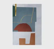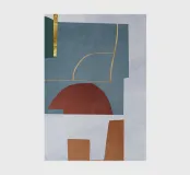 Les formes géométriques et les tons terreux créent un design moderne avec des lignes et des formes abstraites. La composition comprend des rectangles qui se chevauchent et un demi-cercle, soulignés par des accents dorés.