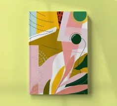 Composition moderne et abstraite présentant un patchwork de motifs et de formes variés. Les éléments comprennent des formes organiques semblables à des feuilles, des grilles géométriques et des textures abstraites dans une palette sourde de rose, de noir et de beige, reflétant un style bohème et éclectique.