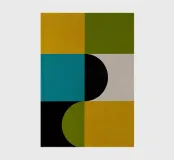 Inspirée par le Bauhaus et l'esthétique moderne du milieu du siècle, cette œuvre d'art présente des blocs géométriques audacieux en jaune, vert, bleu, noir et blanc cassé. Ses lignes épurées et ses contrastes marqués reflètent l'harmonie intemporelle du design moderniste.