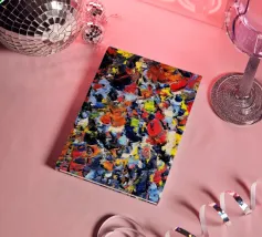This abstract acrylic painting captures the dynamic energy of the action painting technique, inspired by Pollock. Vibrant splashes of colour in red, yellow, blue and white create flowing lines and complex patterns that convey movement and depth.