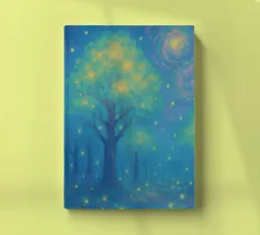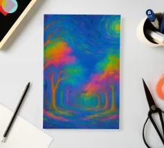 Entrez dans un monde de couleurs vibrantes et de lumière sereine avec cette œuvre captivante. Cette peinture représente un sentier forestier magique qui serpente vers une clairière brillante et lumineuse. Des arbres anciens et imposants, au feuillage bleu et vert profond, créent une arche naturelle qui guide le regard du spectateur. Le sentier ensoleillé est bordé de fleurs sauvages délicates, qui ajoutent des touches de rose et de violet au sous-bois verdoyant. La lueur éthérée au bout du chemin vous attire plus profondément dans cette scène enchantée, promettant un sentiment d'espoir, d'émerveillement et de tranquillité. Cette œuvre d'art est parfaite pour ajouter une
