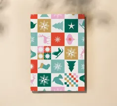 Un joyeux motif en damier aux couleurs vives et audacieuses : bleu, rouge bordeaux, orange, rose, pêche, vert - avec des icônes de Noël simples et minimales : arbre, étoiles, soleil, nœuds, rayures. Cette composition minimale joyeuse célèbre la saison grâce à une harmonie géométrique et des couleurs enjouées. Une pièce parfaite pour donner un air de fête à vos murs, accessoires, serviettes et autres - fait partie d'une collection de Noël.