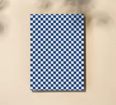 Un motif quadrillé répétitif présente une alternance de carrés bleus et violets, créant un effet de damier. La disposition uniforme produit une illusion d'optique qui renforce la complexité visuelle.