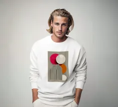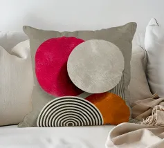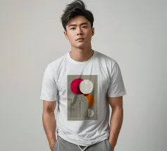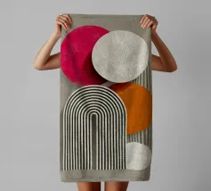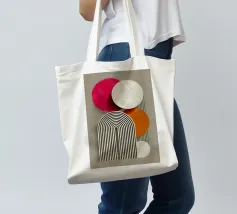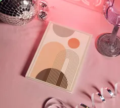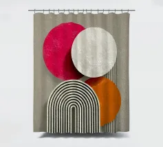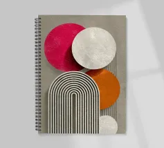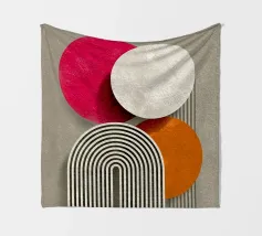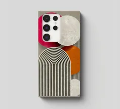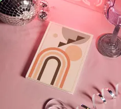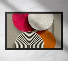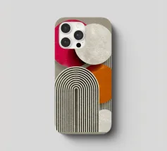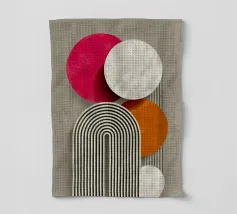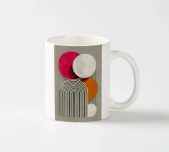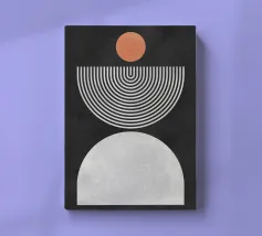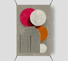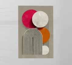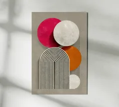 Cette inspiration abstraite Bauhaus allie géométrie et symétrie dans un design moderne. Avec des cercles blancs, des demi-cercles et des rayures en gris, orange et rose, l'illustration crée un jeu de couleurs harmonieux. Les formes architecturales rétro à rayures confèrent à l'œuvre d'art une esthétique minimaliste et structurée.