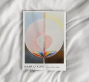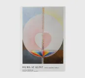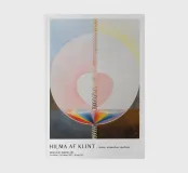 Cette affiche d'exposition captivante présente une œuvre abstraite profonde d'Hilma af Klint, "L'arbre de la connaissance, n° 5", caractérisée par ses spirales éthérées, ses cercles concentriques et son délicat spectre arc-en-ciel. Les douces nuances pastel de rose, de jaune, de bleu et de brun se fondent harmonieusement, créant un sentiment de profondeur spirituelle et d'harmonie cosmique. L'affiche annonce l'exposition "Hilma af Klint - Artist, researcher, medium" au Musée d'art moderne de Stockholm, du 16 février 1977 au 26 mai 1977. Cette affiche numérique de haute qualité (7000x5000 pixels, 300 dpi) capture magnifiquement l'a