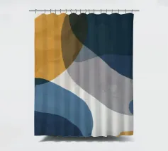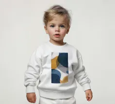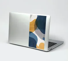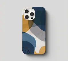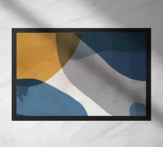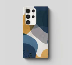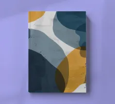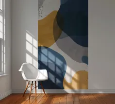 Des formes bleues et ocres audacieuses se chevauchent dans une tension rythmique et fluide.