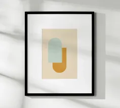 Simple Harmony Cette pièce explore l'équilibre tranquille que l'on trouve dans les formes géométriques simples et une palette de couleurs sobre. La composition est centrée sur un arc chaud en terre cuite, suggérant une porte ou un seuil architectural, qui est partiellement recouvert par un cercle vert sauge. Une délicate ligne horizontale et un petit point gris ajoutent de la précision à des formes autrement douces et organiques. Réalisé dans un style moderne et minimaliste, il crée un sentiment de calme paisible et d'équilibre intemporel.