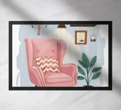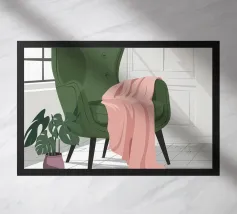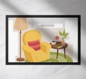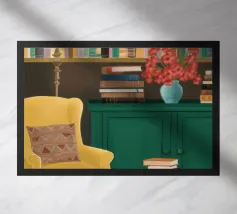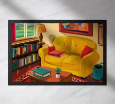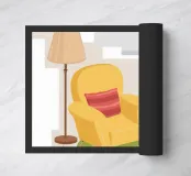 Illustration d'un coin lecture avec un fauteuil jaune confortable, un lampadaire et une table d'appoint avec une plante. Cette scène est un sanctuaire chaleureux, accueillant et parfait pour la lecture et la relaxation.