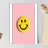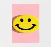 Gros plan d'un bouton de pin smiley jaune sur un fond rose. Flat-lay minimaliste avec espace négatif, haute résolution, finement détaillé et isolé sur un fond sobre. Une correction professionnelle des couleurs, des lignes nettes et une mise au point précise créent une composition claire et esthétique.