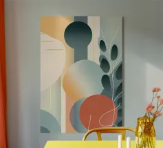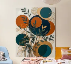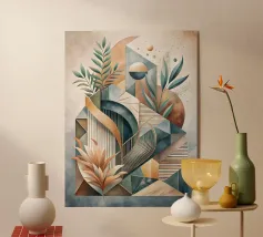 A captivating abstract artwork that blends organic and geometric elements. Lush foliage intertwines with celestial bodies and architectural forms, creating a sense of harmony and balance. The muted color palette and intricate details invite contemplation and exploration.