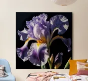 A stunning bearded iris in full bloom, captured in a close-up view against a dark background. The intricate details of the flower's ruffled petals, vibrant colors, and contrasting textures are beautifully highlighted. This exquisite artwork celebrates the beauty and elegance of nature's creations.
