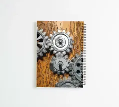 Gear of moving mechanical cogwheels fixed on a wooden panel.