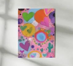 Un patchwork joyeux et réconfortant de plantes stylisées, de motifs vibrants et d'un grand cœur aimant. Cette œuvre d'art éclectique est une célébration joyeuse de l'amour, de la croissance et de la beauté artisanale.