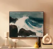 Expressive watercolor seascape capturing the raw motion of waves crashing against dark coastal rocks. Bold brushwork and deep ocean tones convey the drama and power of the sea.