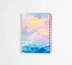 A minimalist scene transports you to a world of peace and harmony. Pink and yellow clouds float in a sky-blue sea of clouds, gently illuminated by a soft light. The gentle ripples on the surface of the water and the fresh colour palette enhance the peaceful atmosphere. Immerse yourself in this dreamlike world and find a moment of relaxation.