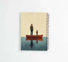 A father and son stand on the edge of an orange-coloured boat and turn away from each other. The background is simple and in soft colours. In a minimalist style, the illustration has clean lines and flat blocks of colour. It creates a calm atmosphere in high resolution