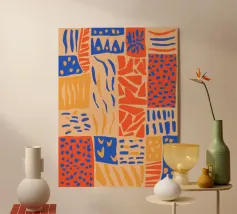 Une composition abstraite moderne et ludique présentant une disposition en grille de formes organiques colorées. L'œuvre ressemble à un puzzle sophistiqué et équilibré de formes et de couleurs.