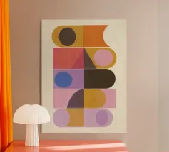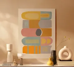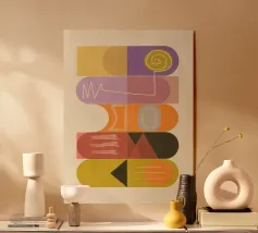 Ce poster moderne combine trois barres verticales et colorées avec une ligne courbe qui serpente à travers l'image. La géométrie claire rencontre le mouvement organique, les couleurs - rose, orange, jaune et violet - créent profondeur et énergie. Idéal pour les espaces créatifs, les concepts d'habitat modernes et les amateurs de design qui souhaitent allier forme claire et légèreté.