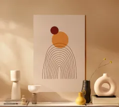 A stylized sun rises over rounded hills, as vertical lines fall like soft rain — a graphic meditation on balance and beginnings. This abstract Bauhaus-inspired piece invites stillness and rhythm into the space it inhabits.