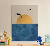 This poster captures the essence of calm with a minimalist sunset (or sunrise) over the ocean. The textured golden circle and silhouetted seagulls create a retro and refined atmosphere. It is perfect for bringing a feeling of vacation or relaxation into a bedroom, living room, or bathroom. Nature art paint, sun art, ocean view, nature wall art