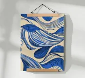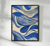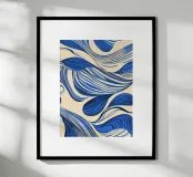 Une illustration dynamique de vagues abstraites dans des tons bleus vibrants sur un fond beige. Ce design fluide et moderne évoque le mouvement et la sérénité, idéal pour une décoration murale élégante et contemporaine.