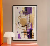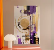 Art moderne avec des formes dorées, des contrastes forts ainsi qu'une texture en violet et blanc. Cette peinture abstraite dégage une énergie intemporelle. Les couleurs se fondent en une composition harmonieuse.