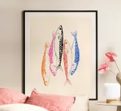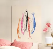 Une illustration vibrante et minimaliste de maquereaux dans un dessin au trait audacieux et multicolore crée un design moderne et artistique inspiré des fruits de mer, parfait pour la décoration, les imprimés et l'esthétique marine.