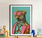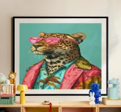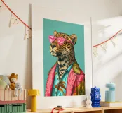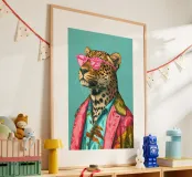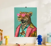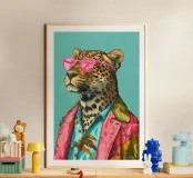 Illustration stylisée d'un guépard charismatique habillé en mode chic et décontracté, avec des lunettes de soleil élégantes et une pose de dandy sûr de lui. Avec sa palette vibrante et sa touche de flair fabuleux, cette œuvre d'art célèbre l'individualité, le style et la confiance en soi. Parfait si vous aimez les vibrations de la faune tropicale avec un esprit moderne.