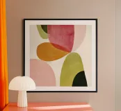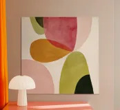 Un jeu harmonieux de formes organiques rendues dans une palette inspirée du milieu du siècle dernier. De doux tons corail, moutarde, olive, blush et forêt profonde se superposent dans un arrangement équilibré rappelant la gravure Art déco. La texture subtile et les lignes épurées évoquent les sérigraphies vintage des années 1950 et 1960, conférant profondeur et chaleur à tout décor. Parfait pour les salons, les bureaux ou les murs de galeries d'art à la recherche d'un clin d'œil à l'héritage moderniste et à l'élégance intemporelle.