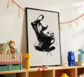 Une œuvre d'art expressive pleine de dynamisme et de contrastes : la tasse noire semble déborder tandis qu'un mouvement plein d'élan forme une figure abstraite à partir de liquide. Entourée d'éclaboussures et de gouttes de peinture sauvages, la scène évoque un mélange de dessin à l'encre moderne et de street art. L'aspect monochrome confère à l'œuvre une certaine élégance qui contraste avec le mouvement chaotique.