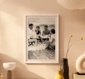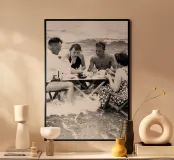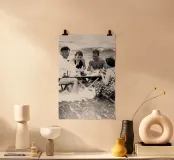 Fête du thé sur la plage, photo ancienne en noir et blanc poster