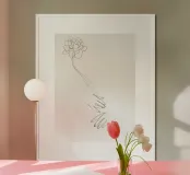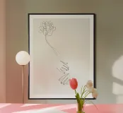 Délicat et raffiné dessin au trait continu de mains élégantes tenant une fleur de pivoine, créé avec une seule ligne noire fluide. Cette illustration minimaliste allie nature et féminité, offrant un accent artistique et intemporel pour les espaces modernes.