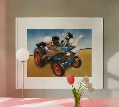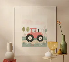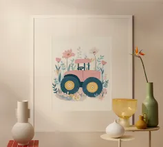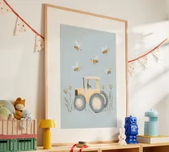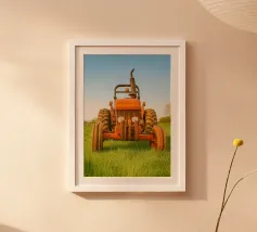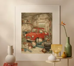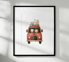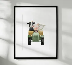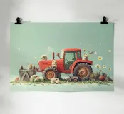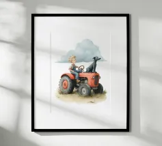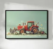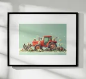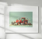 Une illustration picturale réconfortante d'un joyeux groupe de hérissons rassemblés autour d'un tracteur rouge d'époque. Chaque hérisson est adorablement occupé à différentes tâches : arroser des fleurs, transporter des outils ou simplement profiter du cadre ensoleillé de la campagne. Des marguerites délicates, des oiseaux et de la verdure luxuriante complètent cette scène rurale fantaisiste. Parfait pour les chambres d'enfants, la décoration des crèches ou pour tous ceux qui aiment l'art animalier charmant avec une touche de campagne.