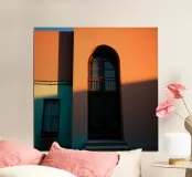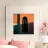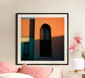 La lumière du soleil du soir projette des ombres sur un bâtiment coloré. poster avec cadre en bois