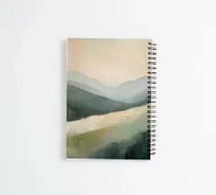 Une peinture à l'huile minimaliste utilisant la technique de l'empâtement et des coups de pinceau vigoureux, représentant des montagnes vertes sur fond de ciel jaune pâle. Une rivière blanche coule à travers la vallée, la palette de couleurs neutres créant un effet apaisant. Les collines lointaines sont dessinées en douceur et présentent un style artistique moderne avec des formes et des lignes abstraites. La composition globale est harmonieuse et l'éclairage doux met la scène en valeur.