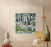 Kirche in Cassone (Église de Cassone) de Gustav Klimt est un paysage serein et pittoresque peint en 1913 pendant le séjour de l'artiste en Italie. Présentant le mélange caractéristique de réalisme et d'abstraction décorative de Klimt, cette œuvre montre un charmant village lacustre couronné par une petite église, encadré d'une verdure luxuriante et des motifs emblématiques de Klimt, semblables à des mosaïques. Riche en couleurs, en textures et en détails, cette estampe est idéale pour ajouter une élégance paisible à n'importe quelle pièce. Un choix parfait pour les amateurs de Klimt, de paysages d'art ou d'architecture européenne, cette reproduction de haute qualité apporte un sentiment de tranquillité et d'intemporalité.