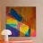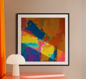 Cette œuvre d'art présente un arrangement vibrant de couleurs, dont le bleu, le rose, le jaune et l'orange. La lumière naturelle crée des contrastes saisissants, renforçant la profondeur de la texture de la peinture.