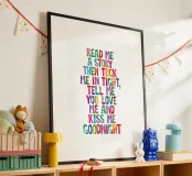 Enchantez la chambre de votre enfant avec cette impression typographique réconfortante. La tendre comptine de l'heure du coucher "Lis-moi une histoire, puis borde-moi bien, dis-moi que tu m'aimes et embrasse-moi pour la nuit" prend vie dans des lettres peintes à la main à l'aquarelle arc-en-ciel sur un fond blanc impeccable. Cette charmante œuvre capture l'essence du rituel du coucher, ce qui la rend parfaite pour les crèches ou les chambres d'enfants. Le motif coloré ajoute une touche ludique tout en célébrant le lien entre le parent et l'enfant. Laissez cette charmante impression servir de rappel nocturne de l'amour et créez des souvenirs précieux à l'heure du coucher.