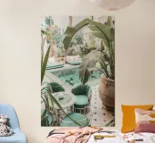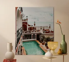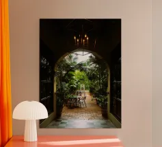 Plongez au cœur de Marrakech avec cette photographie captivante d'un intérieur de riad verdoyant. La verdure éclatante et les détails architecturaux complexes créent une oasis de sérénité, où le design marocain traditionnel rencontre la beauté naturelle. De riches plantes cascadent autour de la piscine de la cour, leurs feuilles vibrantes contrastant avec les élégants sols carrelés. Cette image évoque le calme et l'attrait d'un havre marocain, où l'agitation de la ville s'estompe pour laisser place à une évasion paisible et verdoyante.