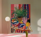Nature morte d'une plante en pot et d'autres objets posés sur une table avec un tapis coloré à motifs en dessous. La composition sur un mur rose est moderne, éclectique et pleine de détails décoratifs charmants.