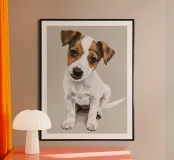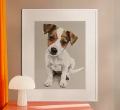 Mignon chiot en position assise avec une expression curieuse poster avec cadre en bois