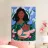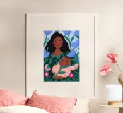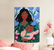 Une mère tenant un bébé enveloppé dans une couverture. L'arrière-plan est composé de grandes feuilles et de fleurs, créant une atmosphère sereine et nourricière.